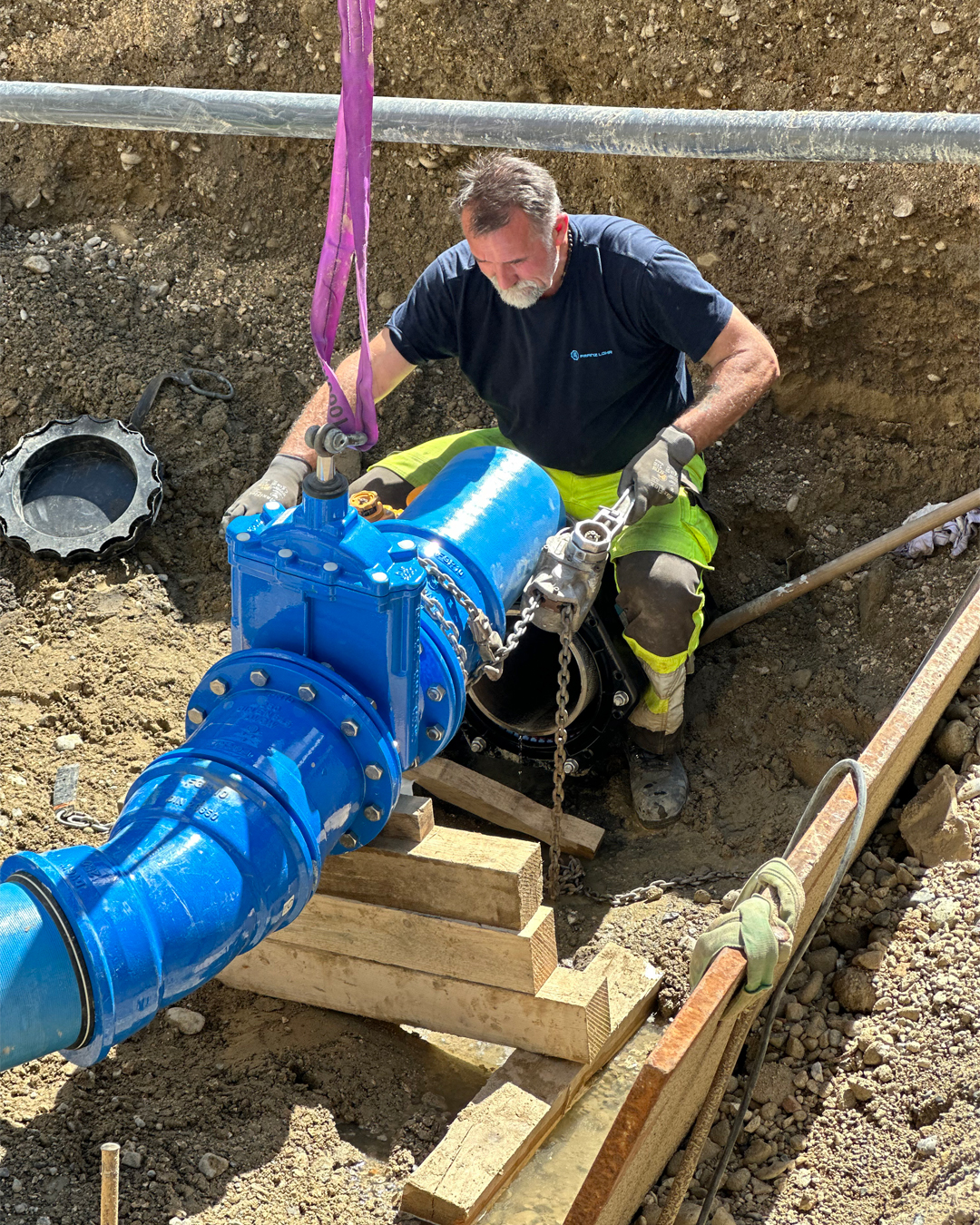 Die Verlegung der Hauptwasserleitung stellte eine besondere Herausforderung dar, da das Gussrohr DN 250 direkt unter dem geplanten Erweiterungsbau verlief. Durch die Umlegung und die Neupositionierung der Hydranten sowie Schieber wurden die neuen Gegebenheiten berücksichtigt.
